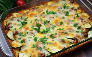 Смачні сезонні овочі легко поєднати з м’ясом і запекти в духовці. Соковиті кабачки додадуть страві неабиякий аромат в поєднанні із соусом за мотивами бешамелі.