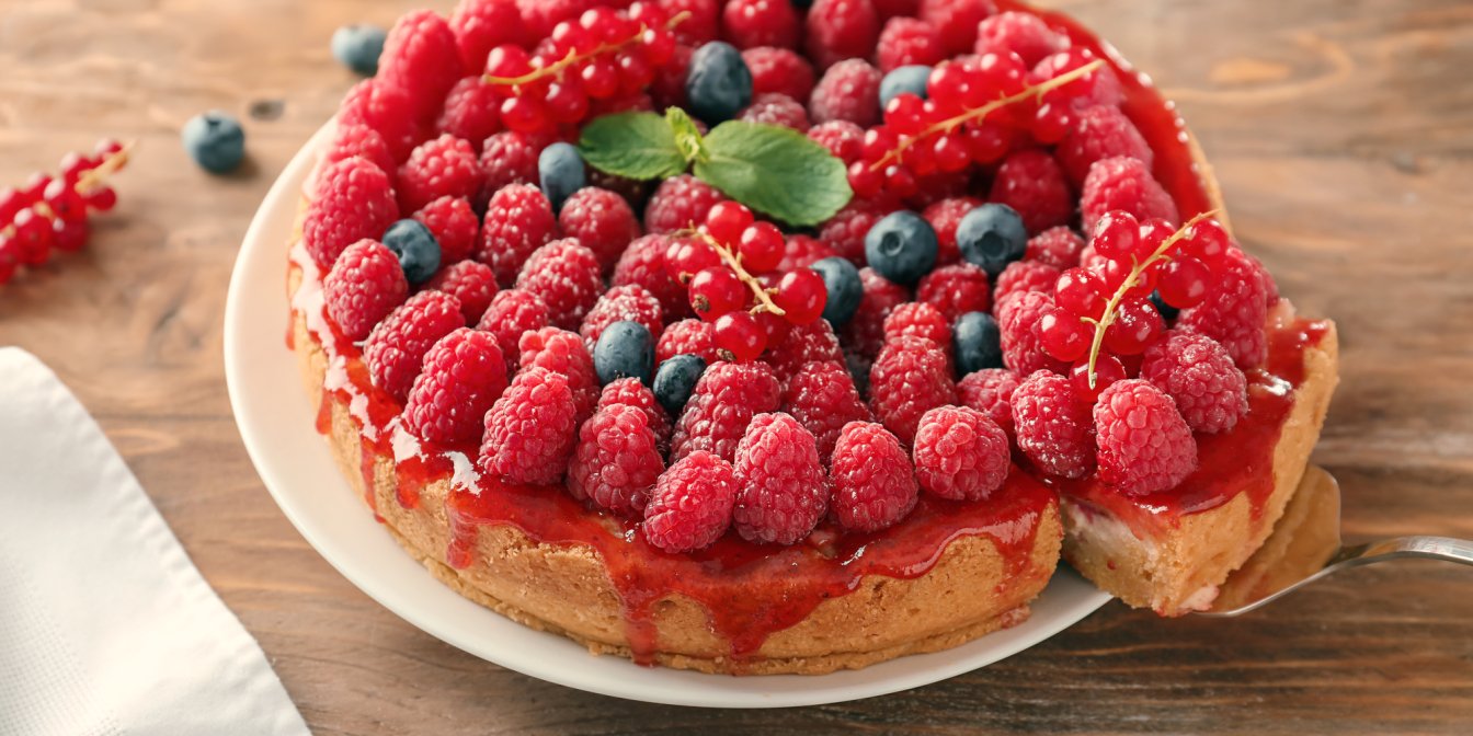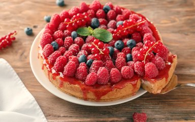 У цього пирога багата смакова палітра, адже в ньому поєднуються одразу три сезонні ягоди: полуниця, порічка та малина. До речі, від ступеня зрілості та сорту ягід випічка може бути як більш солодкою, так і більш кислою. Зважайте на це!
