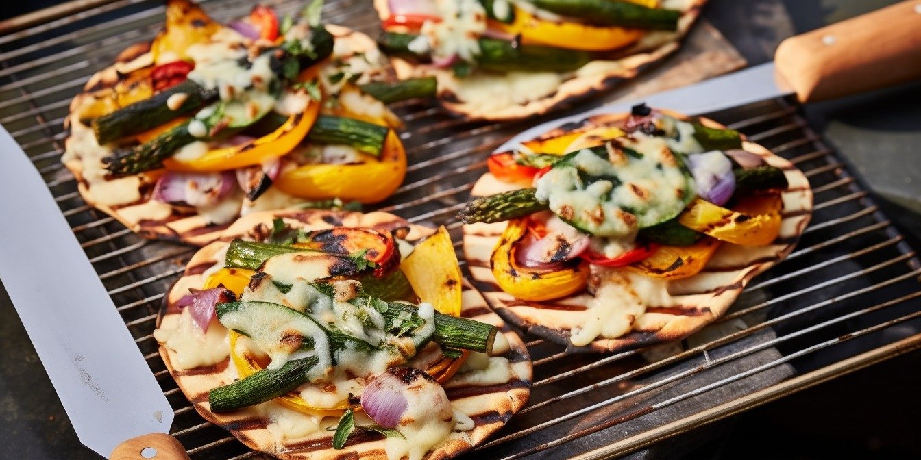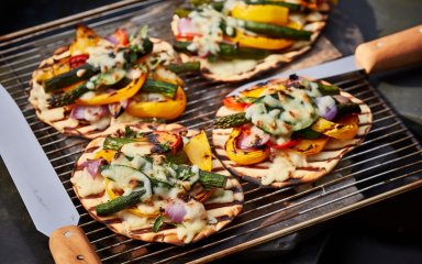 Ця легка піца на будній вечір сповнена сюрпризів. Обсмажте на грилі гриби, цукіні, червону цибулю та капусту — і викладіть їх на куплені в магазині коржі. Посипте блакитним сиром і моцарелою. Готово!