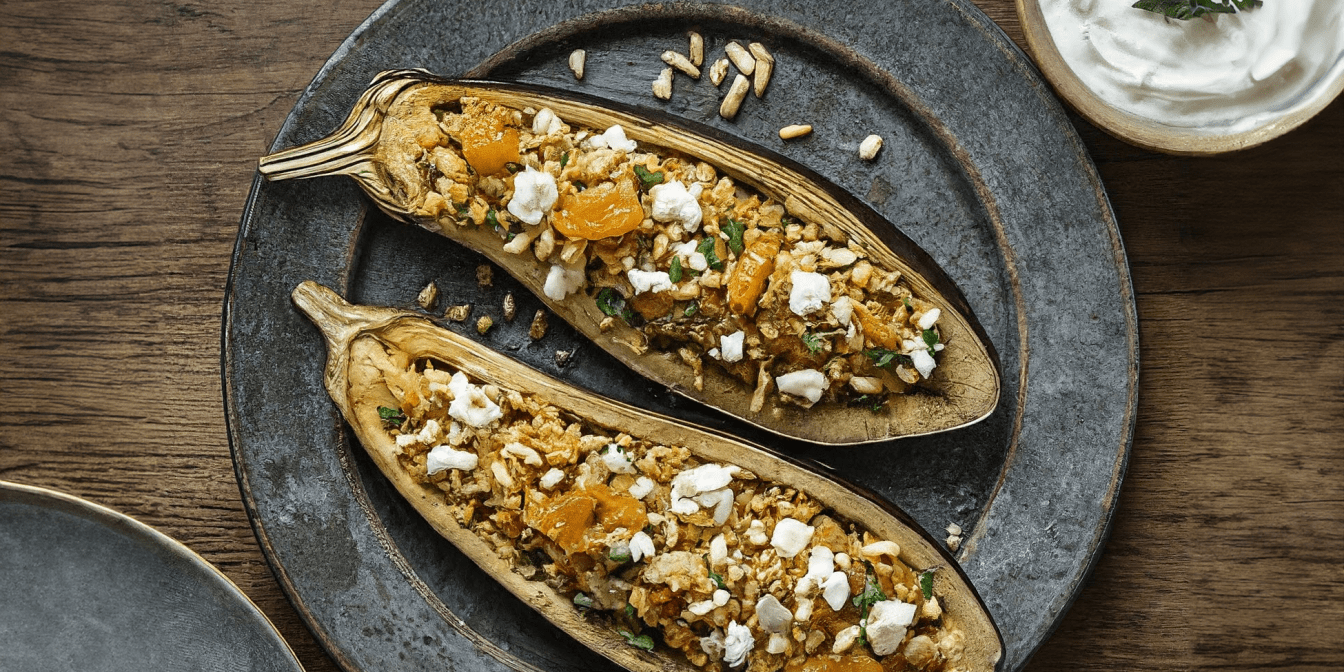 Фаршировані баклажани з булгуром, горіхами й сухофруктами — це смачна, ніжна та ситна страва, яка поєднує в собі різні текстури й смаки. Йогуртово-лимонна поливка перетворить запечені баклажани на справжній кулінарний шедевр. Приготуйте цю оригінальну страву, щоб відкрити для себе нові смаки!