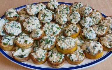 Розкладіть кружальця кабачків на великому тарілі. Викладіть зверху начинку. Примітка: можна викладати начинку поки кабачки ще теплі.