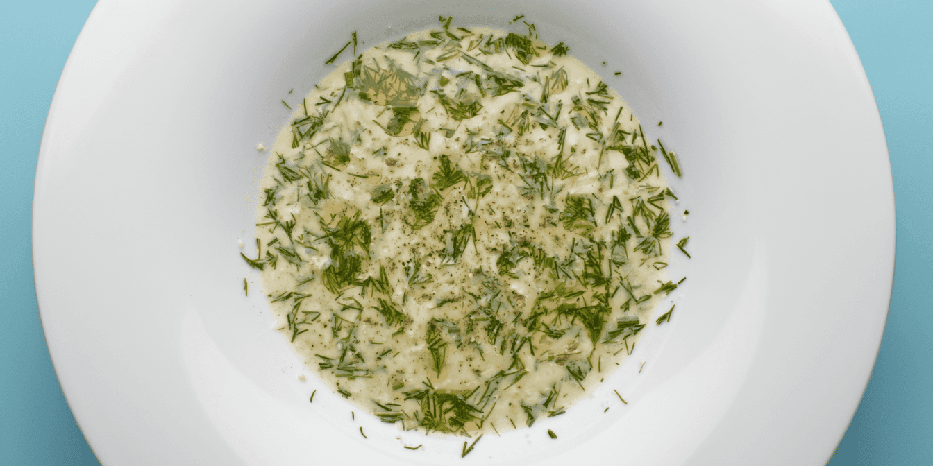 Кріп дрібно посікти, додати до огірків. Додати грецький йогурт і оливкову олію, посолити й перемішати.
