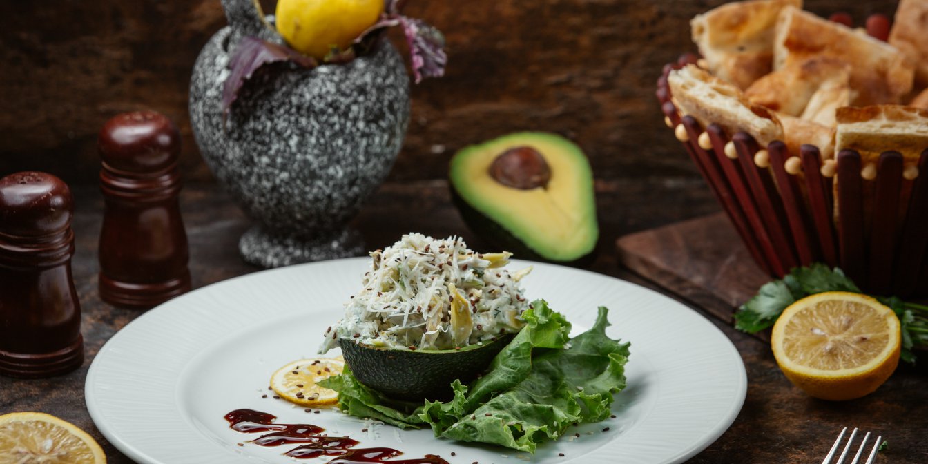 Авокадові човники із салатом з яскравої синьої капусти, хрустких огірків і селери — здорове рішення для вечері.