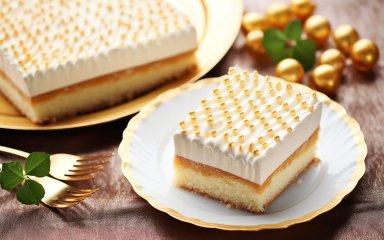 Цей пляцок на основі кисломолочного сиру дуже ніжний, з вершковим смаком і хрумкою скоринкою. Таке враження, що він вкритий золотавою росою — такий ефект створює запечена меренга.