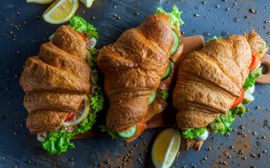 Для першої начинки наріжте тонкими шматочками сьомгу, змажте круасан крем-сиром, покладіть листя салату та рибу. Для другої начинки змажте круасан шоколадною пастою, покладіть нарізаний кружечками банан та присипте цукровою пудрою.