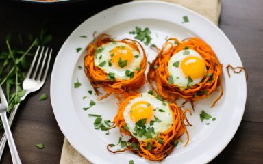 Існує сотні рецептів сніданків з яйцями, але цей справді вартий уваги. Овочеве гніздо з яйцем — ефектна, поживна та корисна страва. Натираємо батат або моркву, викладемо їх на сковороду і всередину розіб’ємо яйця. На все про все потрібно 20 хвилин.