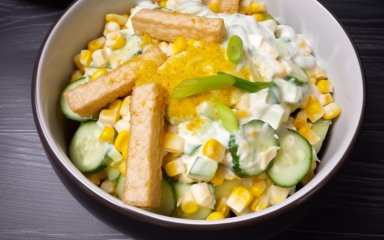 Провідну сопілку в страві грає сир сулугуні «косичка». Додайте свіжий огірок, сухарики і консервовану кукурудзу, яку можна приготувати власноруч.