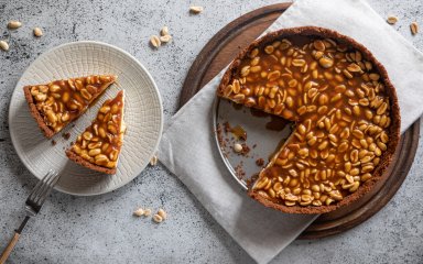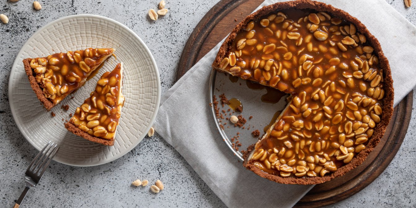 Викладіть на чизкейк арахіс, залийте карамеллю та поставте у холодильник до повного застигання.