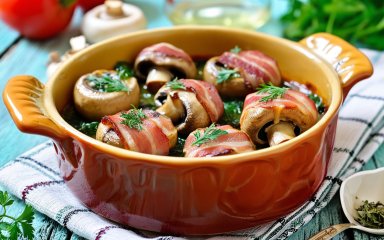 Увага: ти можеш запекти печериці в беконі. Розігрій духовку до 180°С, виклади печериці на застелене деко і готуй 15-20 хвилин.