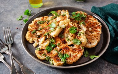 Приготовану таким чином цвітну капусту називають стейками, хоча ця страва не має нічого спільного з м’ясом. Але завдяки формі пластів капусти, які дуже схожі на класичні шматочки телятини з кісткою, страва отримала таку цікаву назву. Кухар і переможець шоу «МастерШеф-7» Вадим Бжезинський демонструє, як приготувати ці вегетаріанські стейки швидко і просто: