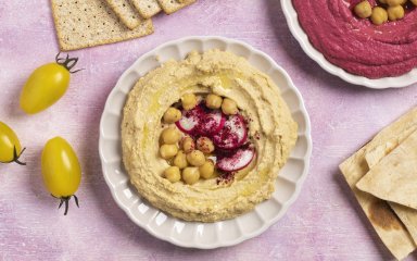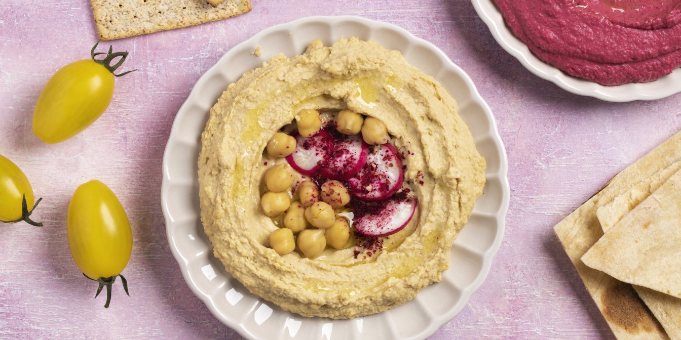 Хумус, як і інші бобові, містить велику кількість клітковини та має низький глікемічний індекс, що робить його гарним вибором для контролю рівня цукру в крові. Для здорового перекусу рівномірно розподіліть 1-2 столові ложки хумусу на 2 тонких цільнозернових крекерах. Додайте скибочки твердих червоних помідорів, щоб отримати додатковий заряд вітамінів — соковиті помідори містять вітамін С.