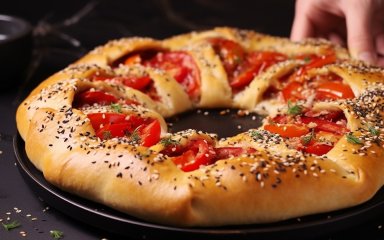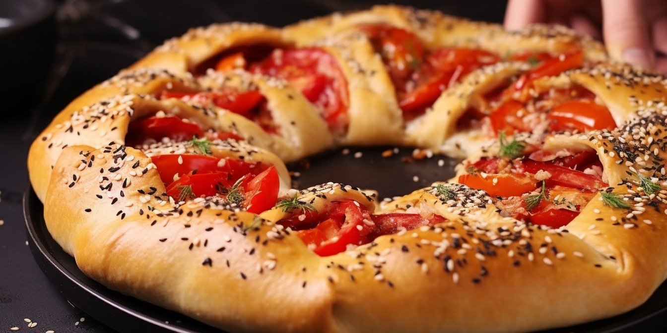 Зробіть 6 надрізів в центрі, не доходячи до начинки 5 см. Закріпіть гострий шматочок тіста до краю, як на відео. Таким чином, щоб тісто гарно зʼєдналось з внутрішньої та зовнішньої сторони. Присипте кунжутом зверху.