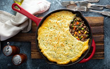 Пастуший пиріг — це так просто! Він готується з картопляного пюре та м’ясного фаршу, інгредієнти викладаються шарами та запікаються до рум’яної скоринки (цьому сприяє гарна порція сиру). Порада від шефа: додайте у страву червоне сухе вино — це точно не завадить!