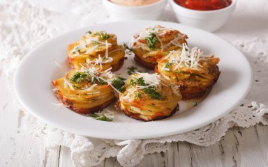 Для ідеального результату картопля має бути крохмалистою й однакового розміру, а слайси — однакової товщини. Ретельно і рясно змастіть формочки для кексів, щоб картопляні стопки виймалися без зусиль і цілими. Дайте готовій картоплі трохи охолонути у формах, щоб слайси схопилися.