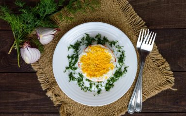 У майонез радимо додати декілька подрібнених зубчиків часнику до свого смаку. Щодо зелені, то беріть асорті — петрушку та кріп. Вони поєднаються з картоплею та прикрасять салат по боках.