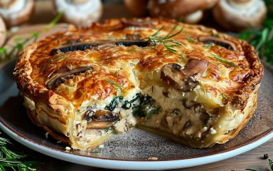Важко пройти повз м’ясний пиріг, коли він має такий гарний вигляд і смак — золотисті млинці, шовковиста сирна намазка із зеленню й часником і обсмажені гриби роблять його обов’язковим до спроби.