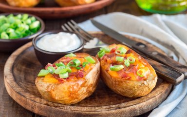 Помістіть сиру картопляну м’якоть у кухонний комбайн разом з цибулею, 1/4 склянки сиру, сметаною, часником, сіллю та перцем. Змішайте інгредієнти до консистенції дуже грубого пюре (не до пасти). Ложкою суміш покладіть в картопляну шкаралупу, зверху посипте чеддером, що залишився, і панірувальними сухарями.