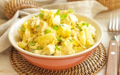 Якщо ви любите комбінацію курятини з ананасом — цей салат для вас. Готується він надзвичайно швидко, треба лишень зварити яйця і куряче філе, а далі залишиться тільки порізати все й перемішати.