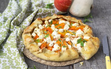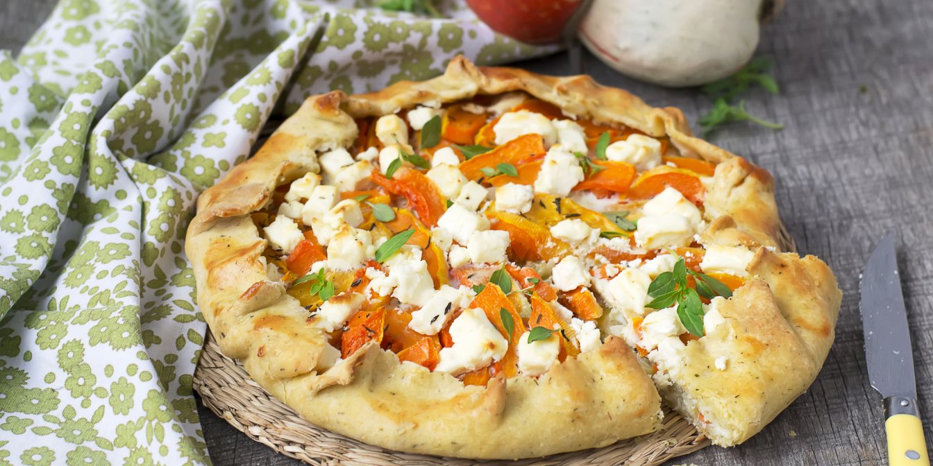 В оригіналі галета — це сухі житні коржики, що вживаються моряками на кораблях замість хліба, або пласке сухе печиво з прісного тіста. А ще це плаский пиріг, який випікається на деку, а не у формі — тому краї не обрізаються, а завертаються поверх начинки. З’єднуємо два поняття, додаємо ароматний солодкуватий гарбуз, гострий сир і трохи спецій і отримуємо прекрасну закуску.