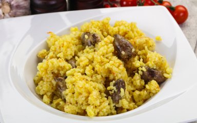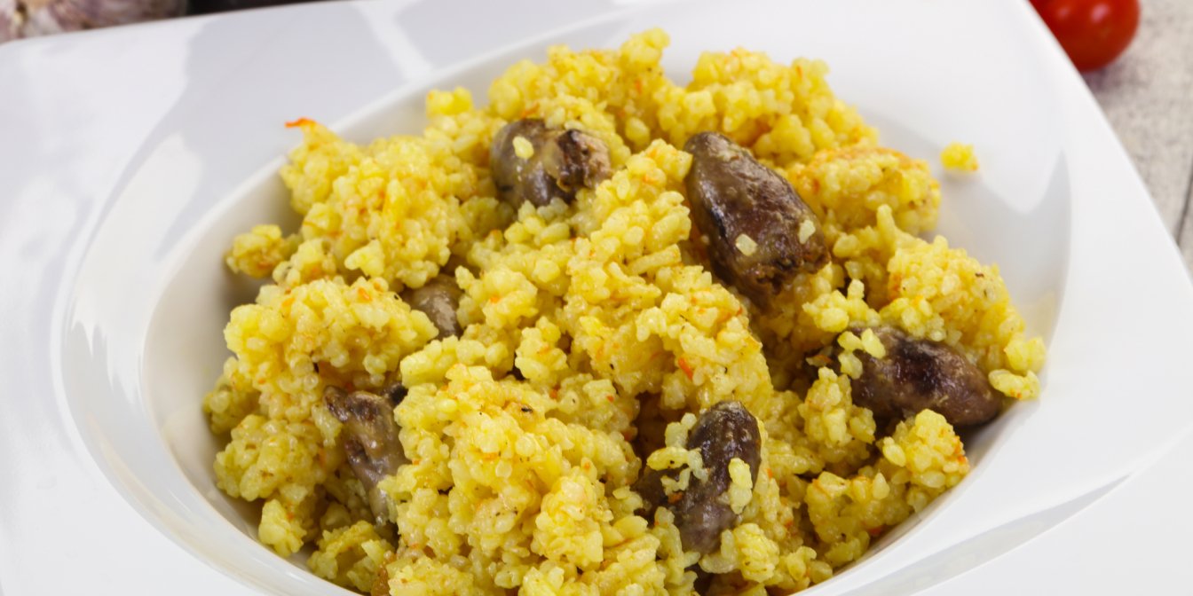 Ця страва з рису та потрушків — чудова альтернатива плову та гарний варіант простої, корисної, оригінальної вечері або обіду. Курячі сердечка маленькі та ніжні, вони швидко готуються, що робить їх ідеальним рішенням для буднього дня.