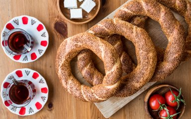 Симіт — це простий у приготуванні турецький хліб у формі кільця, щедро посипаний кунжутом, іноді насінням льону, соняшника чи маку. Він смакує з чаєм, айраном, варенням або сиром, а також його можна використовувати як булочку для бутербродів. Пригощайтеся симітами на сніданок або обід.