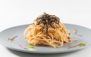 Коли паста буде готова, злити воду й одразу перекласти в миску із соусом з ікрою. Перемішати, щоб соус добре огорнув кожну спагеті. Прикрасити нарізаним норі й одразу подавати.