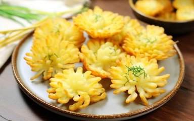 Візьміть глибоку сковороду, наповніть олією і розігрійте її на середньому вогні. Лайфхак: якщо хочете перевірити, чи нагрілась олія, візьміть на виделку чи ніж маленький комочок карохмалю і занурте його. Якщо він зашипить, олія готова. Візьміть заготовку, акуратно стряхніть з неї залишки крохмальної посипки і покладіть у сковороду. Щоби закуска вийшла якомога хрусткішою, під час приготування поливайте її зверху гарячою олією. Коли картопля підсмажиться з одного боку, переверніть її і посмажте до хрусткості з іншого. По готовності дістаньте шумовкою і викладіть на решітку, щоби зайва олія стекла. Коли «квіти» охолонуть, ви можете обсмажити їх ще раз по 10 секунд з кожного боку — так страва вийде максимально хрусткою. Готові снеки посипте сирним порошком.