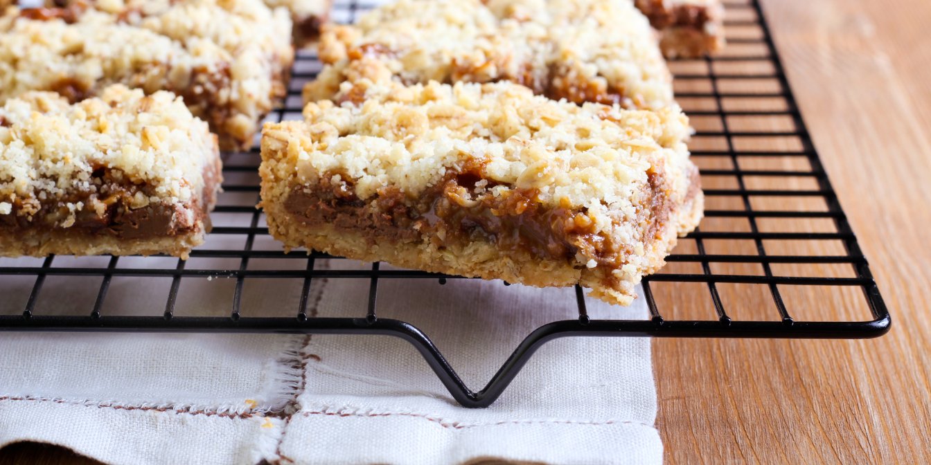 Розподілити суміш у формі. Випікати від 35 до 40 хвилин. Дати охолонути у формі 10 хвилин. Потім розрізати на квадрати або прямокутники.
