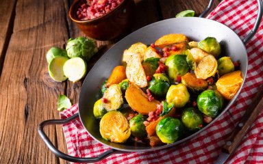 Брюссельську капусту зазвичай уявляють тушкованою, розімлілою, в компанії таких самих м’яких тушкованих овочів… А в цьому салаті вона свіжа, ще й із гранатовими зернами. Хіба що моркві не пощастило: в духовці опинилася. Але є гарна новина: горіхи теж побували на гарячій пательні, тож разом усе це буде смачно!