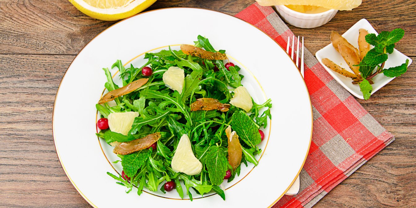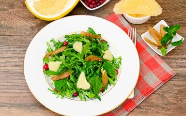 Рукола зазвучить по-новому в ансамблі із салату ромен, козячого сиру та гранатових зерен! Справжня музика смаку, на яку не шкода витратити грошей — небагато, до речі! — щоб провести цей вечір у компанії найкорисніших продуктів!