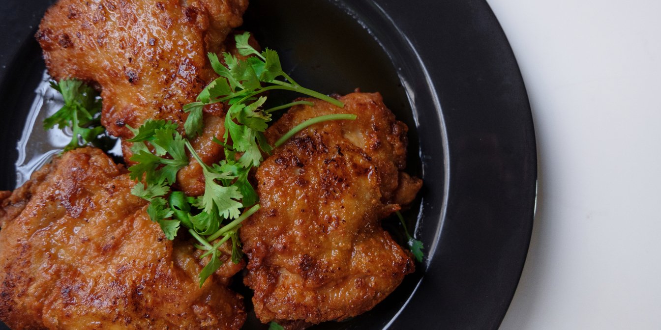 Вийміть із пательні часник і розмарин, натомість покладіть курячі стегна. Обсмажте їх на середньому вогні з усіх боків до утворення золотавої скоринки.