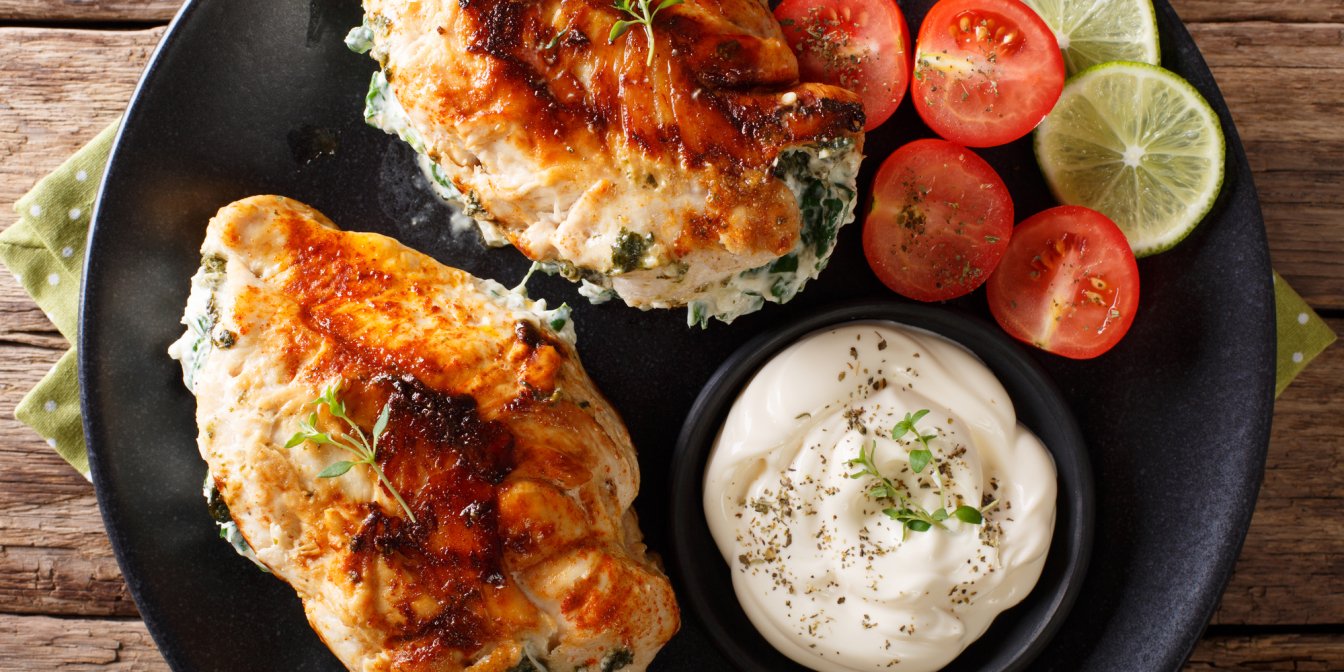 Вимийте і наріжте шпинат. Можна використати консервований замість свіжого — намастіть його ложкою на кожен шматок курки. Свіжим шпинатом посипте м’ясо.