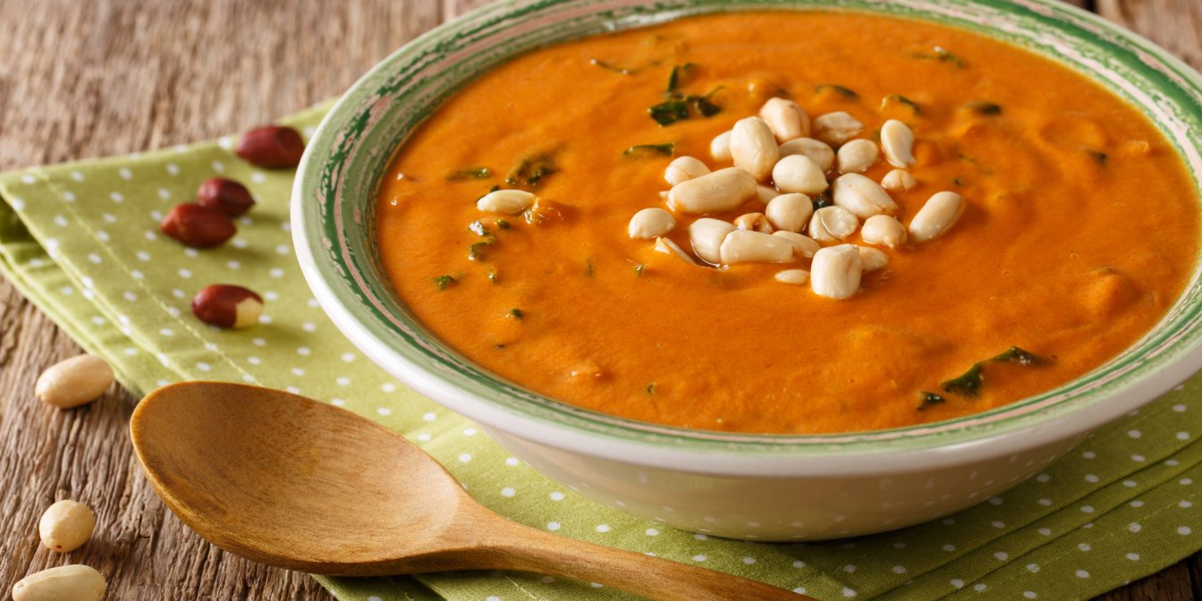 Змішайте у блендері очищені від шкірки помідори, зубчики часнику, курячий бульйон, обсмажений арахіс. Перемелюйте протягом 3 хвилин. Процідіть утворену масу крізь сито.