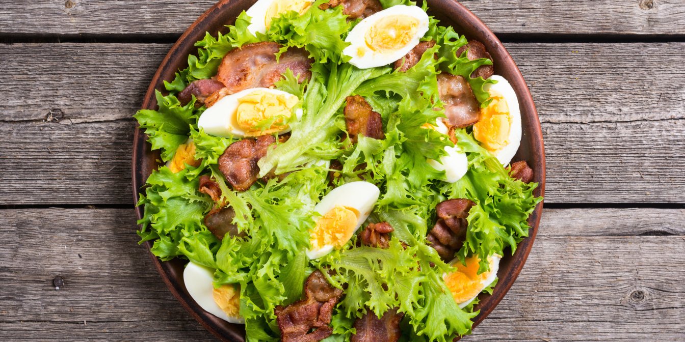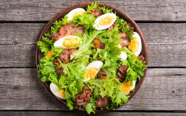 Цей салат сповнений свіжих овочів і зелені, ситних інгредієнтів у вигляді яєць і невеликої кількості бекону. З таким набором він замінить повноцінний обід або вечерю.