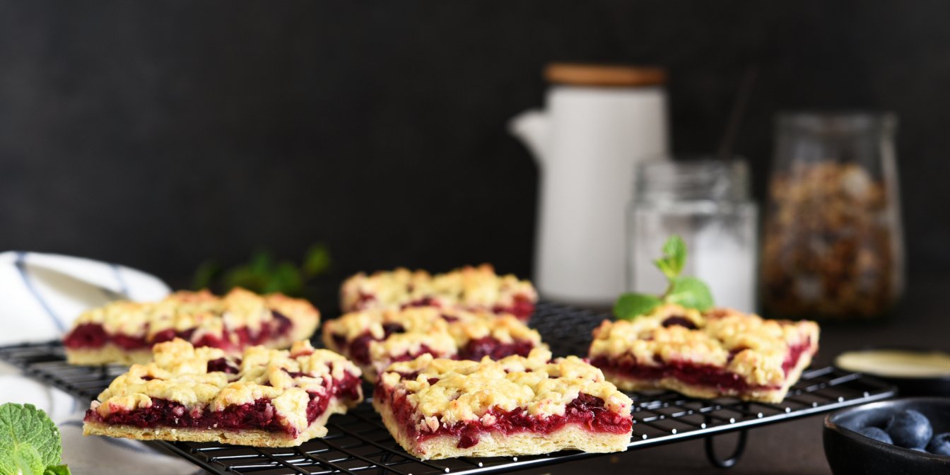 Тісто в деку змастити варенням або джемом, зверху натерти решту тіста. Випікати 35-40 хвилин за 180°С. Нарізати на квадратики.