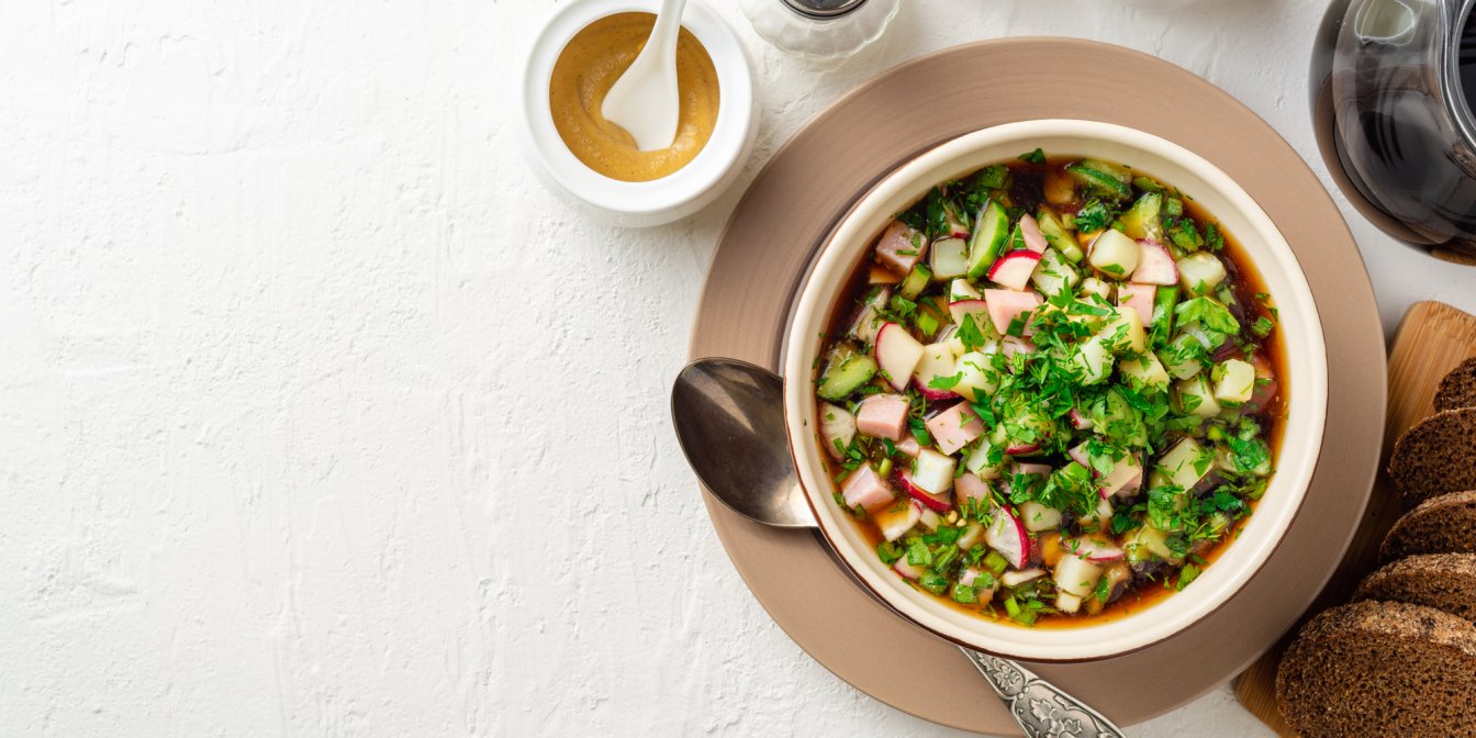 Покладіть масу в тарілку для подачі, посоліть та поперчіть до свого смаку. Залийте квасом та перемішайте.