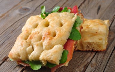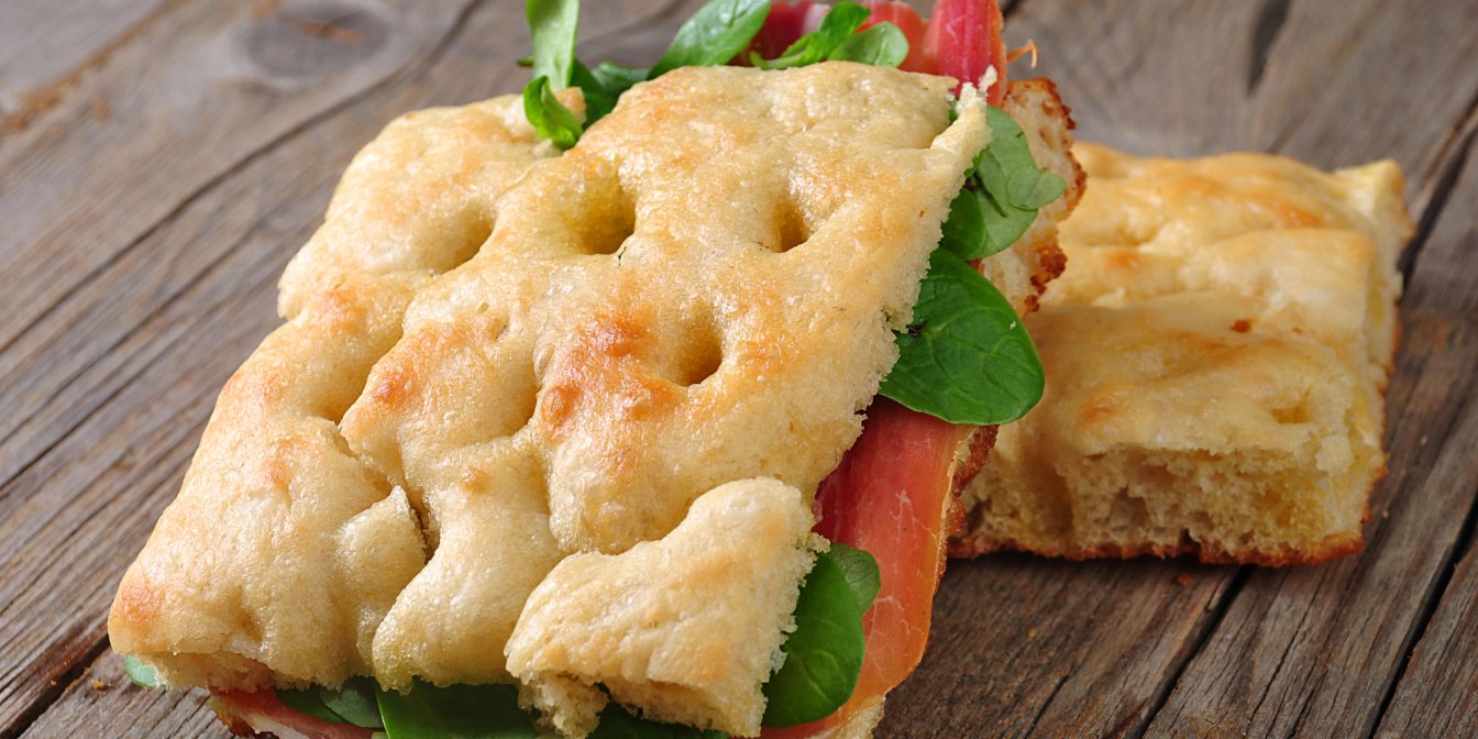 Що може бути краще за смачну італійську фокачу, ароматну і хрумку зверху, м’яку всередині. Додайте соковиту начинку із запеченої шинки, листя салату і свіжого помідора та отримаєте чудову вечерю, сніданок або перекус.