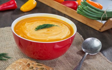 Готувати цей суп дуже просто: підрум’яньте овочі у великій каструлі, додайте куряче філе і картоплю, залийте водою і варіть до готовності. Приправте спеціями, перебийте блендером, прикрасьте сметаною і подавайте до столу.