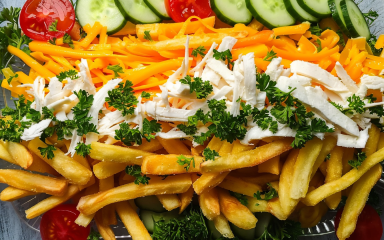 На велику тарілку шаром викласти курку, змастити майонезом. Далі — помідори, майонез, сир, майонез, огірки, майонез. Останній шар — картопля.