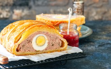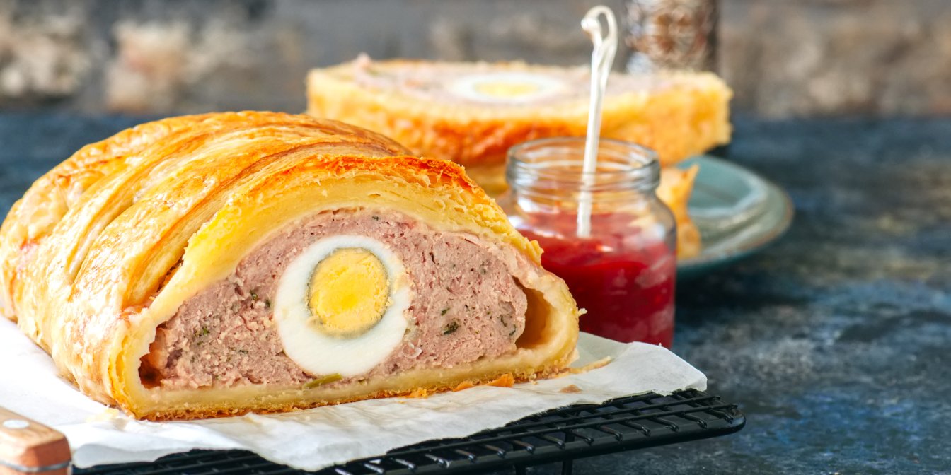 Варені яйця загортаємо у соковитий м’ясний фарш, а його — у дріжджове тісто й запікаємо у духовці. Це дуже ефектна і пишна страва до свята.
