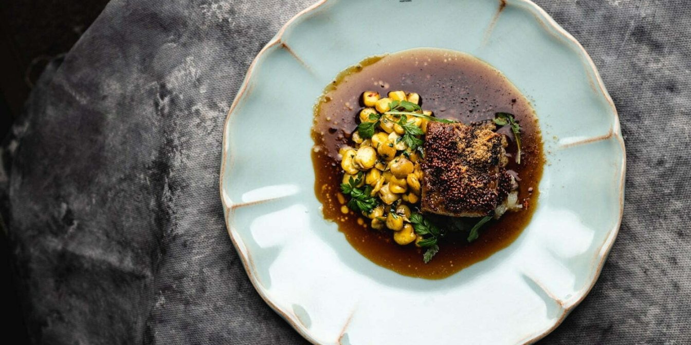 В кожній зі страв використовує оцей ферментований буряковий сік. Робить на ньому тісто для галушок, глазурує в ньому м’ясо, додаючи часниковий мед, пасту з фундука та bean to bar шоколад від сестер з Луцька.