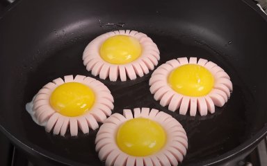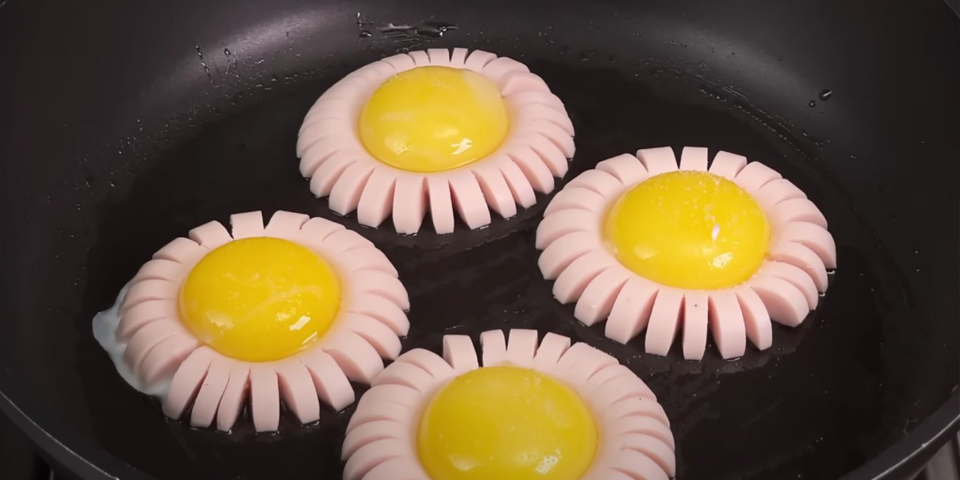 Такого сніданку ви ще не їли! Сосиска та яєчний жовток, оформлені в дивовижну квітку, покращать ваш настрій із самісінького ранку. Візьміть трохи зелені й створіть зі смачних квітів справжню галявину!