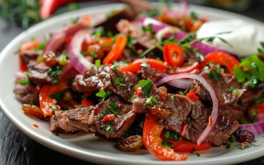 Смажена яловичина в комбінації з болгарським перцем, цибулькою і розкішною заправкою — це просто щось особливе! Такий теплий салат подають відразу після приготування, а з’їдають миттєво — настільки він смачний!