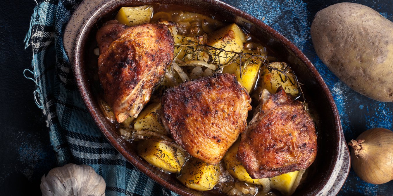 Соковиті й м’ясисті курячі стегенця запечені з картоплею і сухофруктами, — це дійсно вечеря мрії. Чорнослив і курага у поєднанні з овочами та спеціями створюють незабутній пікантний смак. Спробуйте!