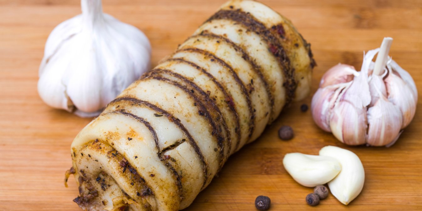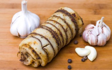 Здивуйте гостей новою смачною стравою — незвичним рулетом, у якому роль верхнього шару виконує тоненьке сало, а за начинку слугує соковита, ніжна телятина із часником і морквою.