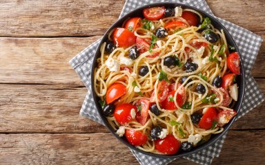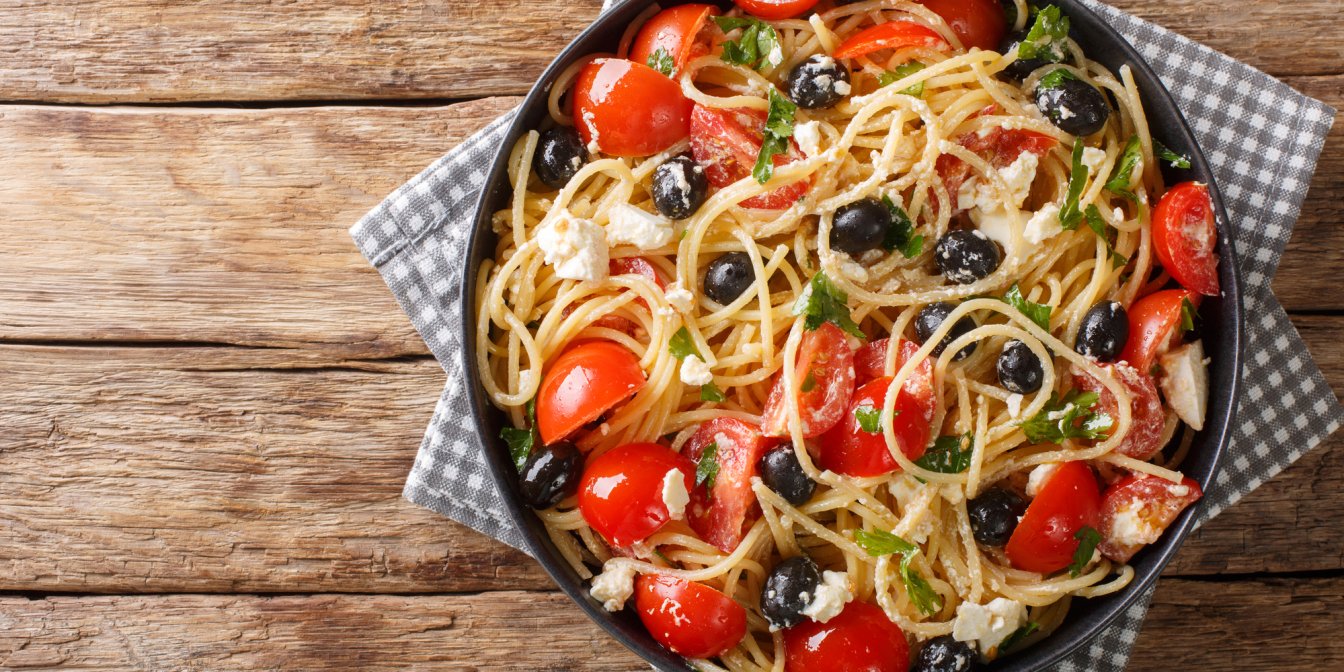Традиційне поєднання макаронів, сиру, помідорів і оливок ідеально підходить для ситного гарніру або легкої основної страви. Уся ваша родина буде насолоджуватися цим ситним теплим салатом зі спагеті, який добре поєднується зі смаженою куркою або ростбіфом.