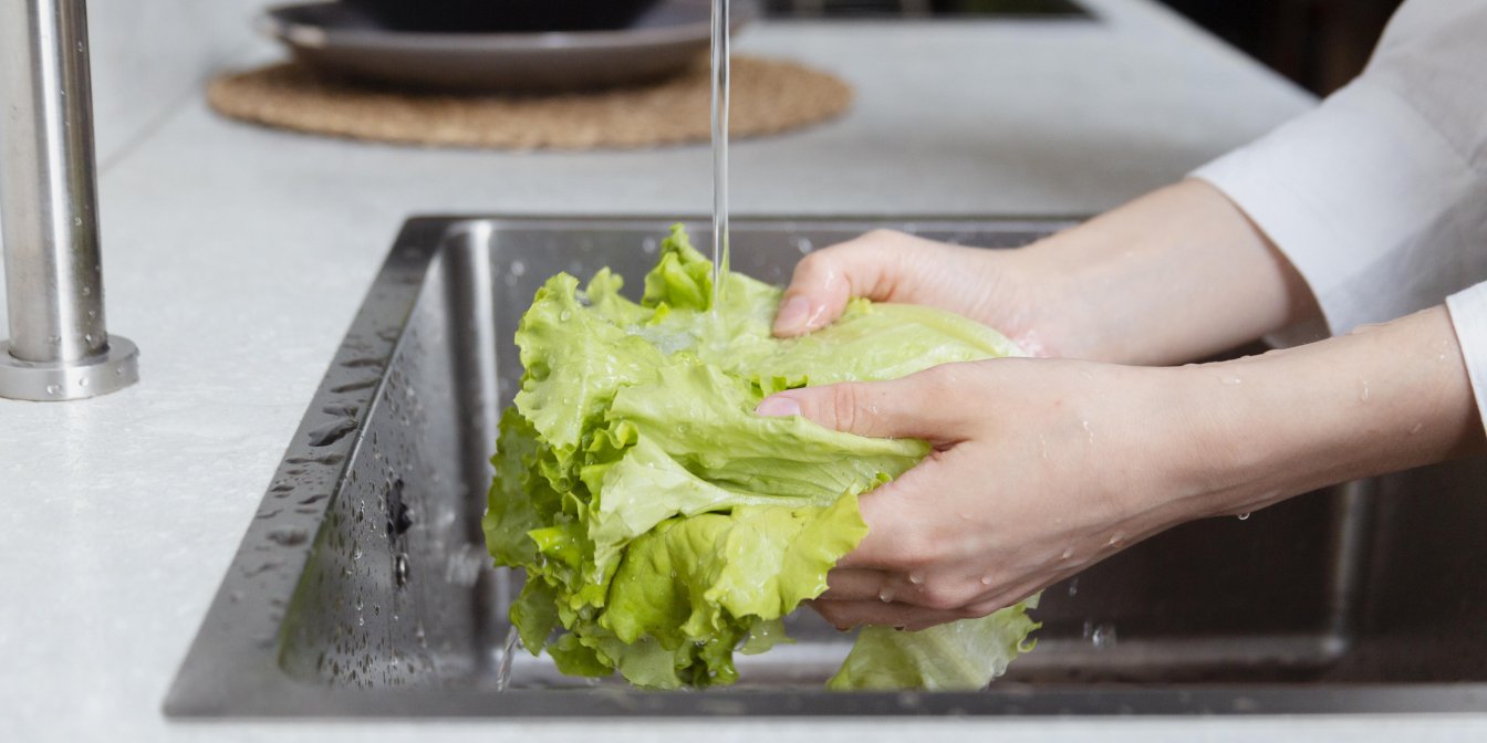 Повністю занурте продукт у розчин із 2 чайних ложок харчової соди на 1 літр води на 30 секунд, а потім промийте під проточною холодною водою.