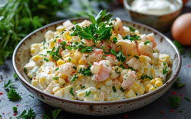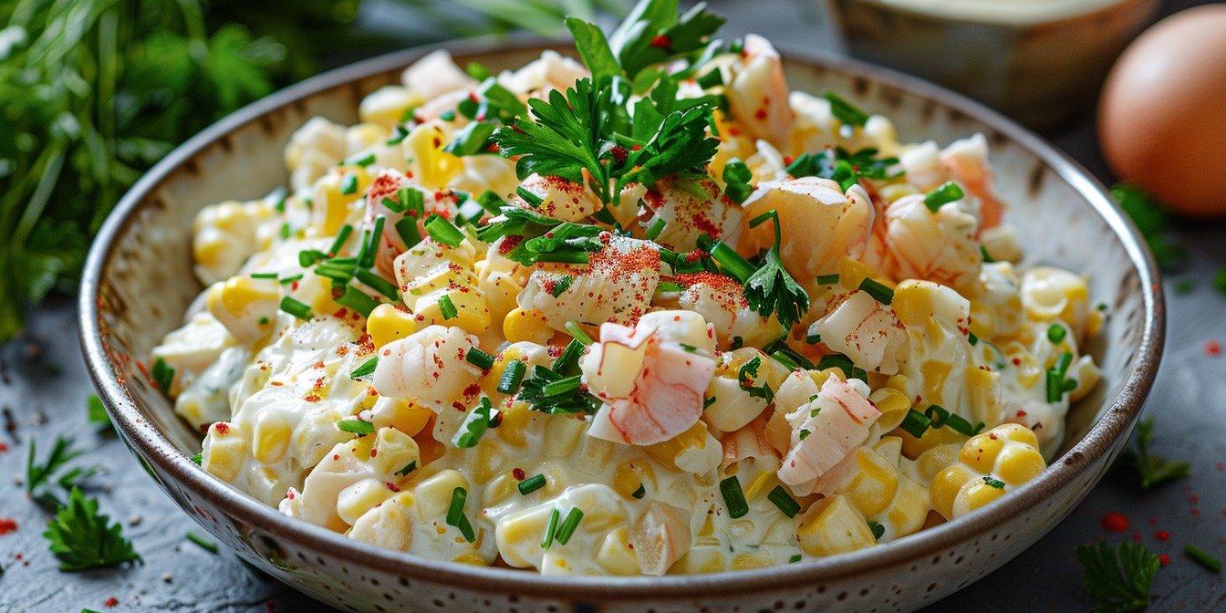 Що нового в цьому салаті з крабовими паличками? Заправка! Зазвичай салати з крабовими паличками заправляють майонезом, але ми пропонуємо вам полегшений варіант із грецьким йогуртом.