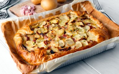 Шукаєте гарний і смачний спосіб подати картоплю? У нас є такий! Просто запечіть попередньо відварену картоплю з тертим сиром, а далі накрийте начинку тонким листковим тістом. Вам сподобається поєднання трьох ароматних інгредієнтів — сиру грюєр, суміші перців і розмарину. Також, якщо є бажання, можете додати трохи часнику або цибулі.