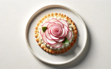 Для троянд наріжте велику редиску дуже тонко, а краще натріть на мандоліні. Складіть слайси в ряд так, щоби вони наполовину перекривалися, й скрутіть рулетиком, як на відео. Розріжте рулетик навпіл і вставте зрізом у салат. Зверху має розкритися троянда. Прикрасьте у такий спосіб всі канапки.